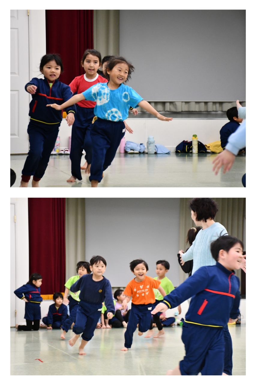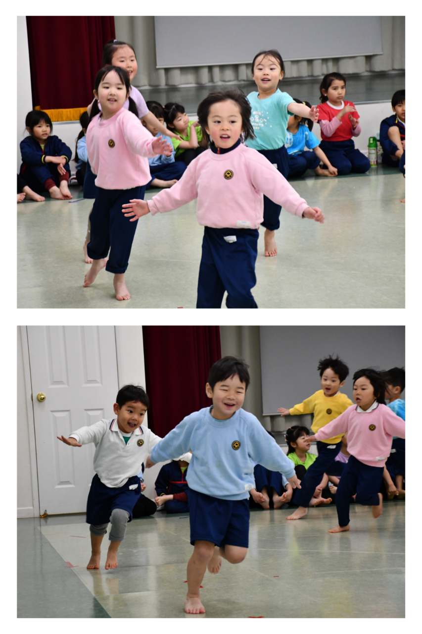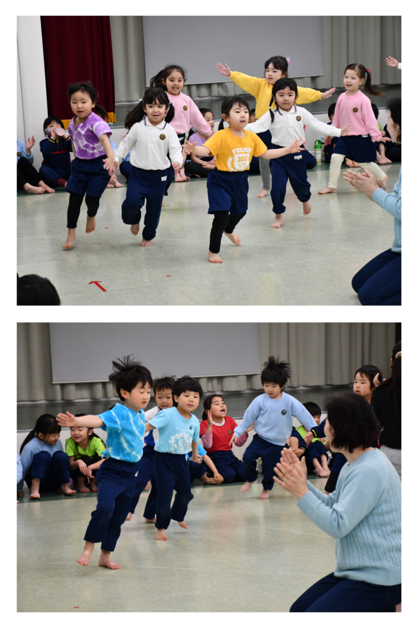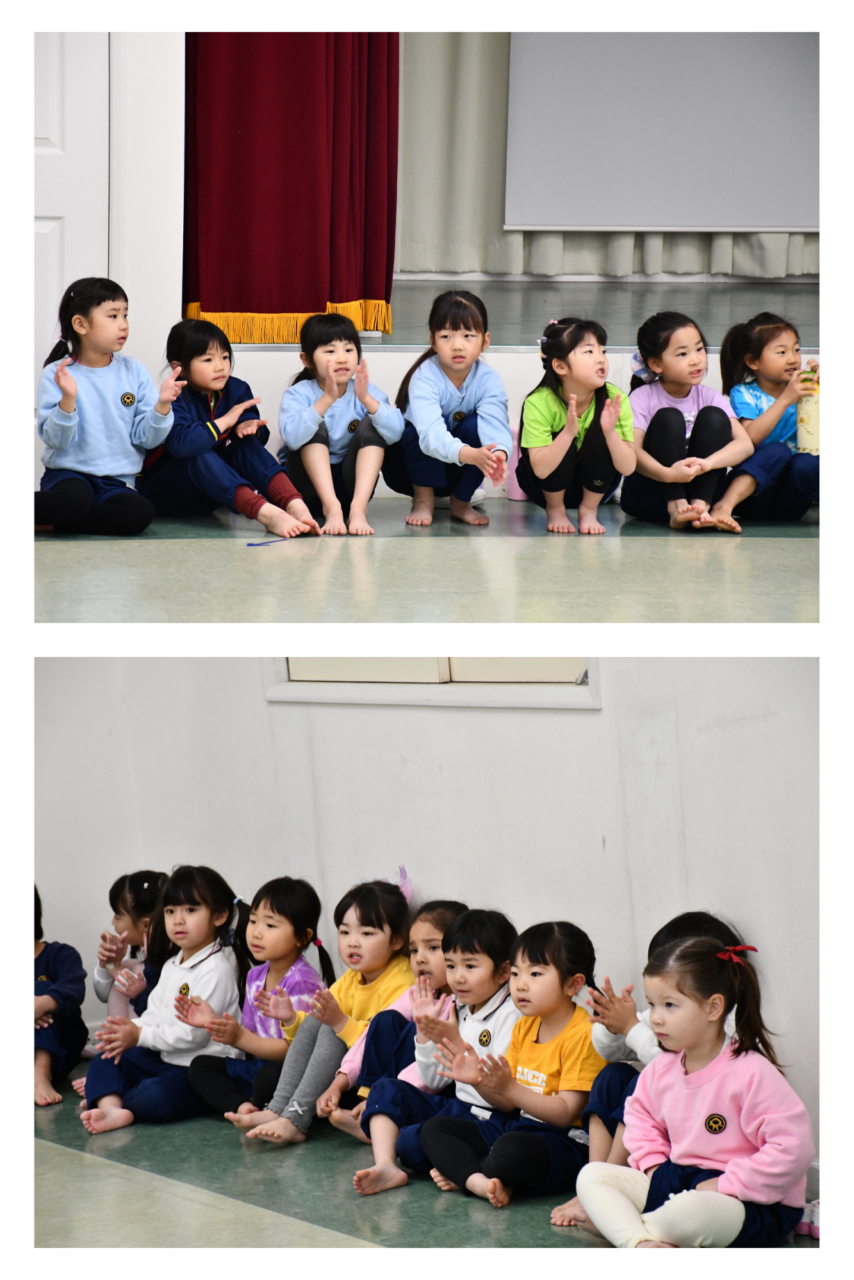 今日は、年少児、年中児、年長児合同でお別れリトミックがありました。小さい学年のお友達は大きいお姉さん、お兄さんのダイナミックな動きを目の当たりにし、目をキラキラさせていました。いつもと違う雰囲気の中でのリトミックは、大盛り上がりでした!もう少しで年長さんともお別れですが、楽しい思い出をみんなで一緒に作ることができました。